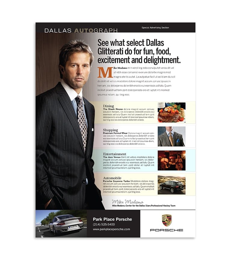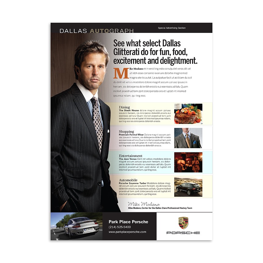 An advertorial program developed for Park Place Motorcars in Dallas, Texas. Specifically targeting the potential Dallas buyers of premium automobiles such as Mercedes and Porsche, the campaign featured local celebrities and the high-end lifestyles that they enjoy. These would include Sports Personalities, Entrepreneurs, Corporate Moguls, Entertainers, Restaurateurs, and Socialites. The offerings could have included co-op buy-ins of the businesses featured in the ads if desired, helping develop relationships through the magazine’s advertising channels.