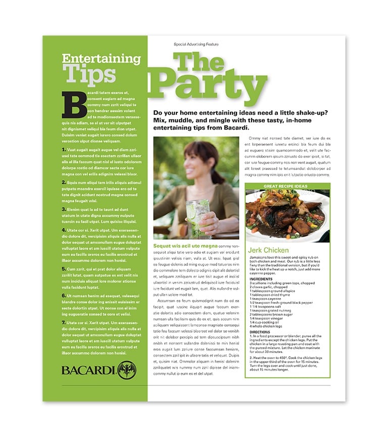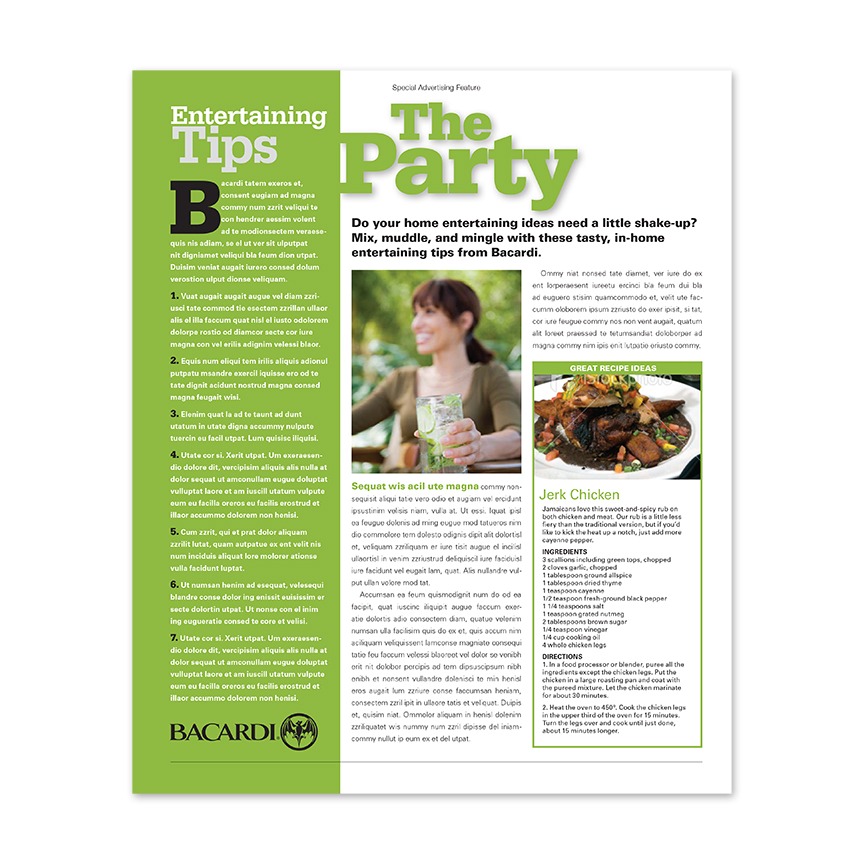 This advertorial concept was developed to work with a full page ad placement by the targeted advertiser. Creating a spread layout with financial incentives for the client, this content would focus on the readers’ use of the product. Food, beverage and entertainment, recipes and celebration ideas that would involve the products of Bacardi or similar brands. The editorial content would present seasonal, holiday and event themes that would engage the readers’ lifestyle and its application of the advertisers product.