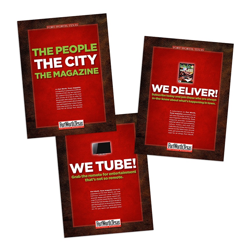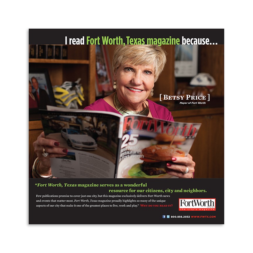 This campaign series used interviews with influential local personalities to describe their appreciation for the publication. These testimonials highlighted the monthly features and benefits of the magazine provides to its readers. Presenting the connection to the city’s culture, history, news and events, the campaign was successful in increasing new stand purchases, subscription numbers, website visits, and overall use of the magazine as an effective go-to tool for all things Fort Worth.
